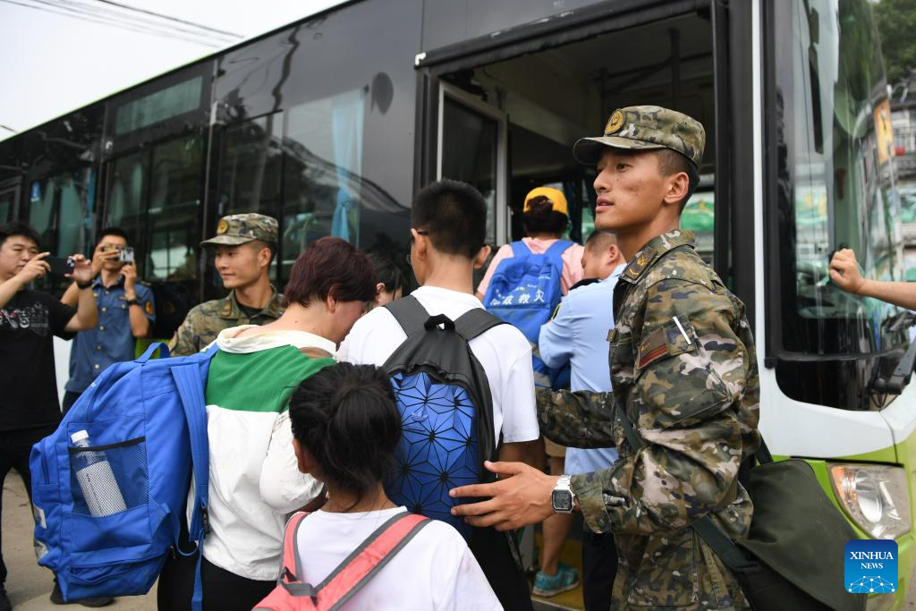 Soldiers lead passengers to get on a transshipment vehicle in Miaofengshan Town of Mentougou District, Beijing, capital of China, Aug. 2, 2023. Train passengers trapped in Mentougou District due to heavy rainfall have been safely transferred on Wednesday. (Xinhua/Ju Huanzong)