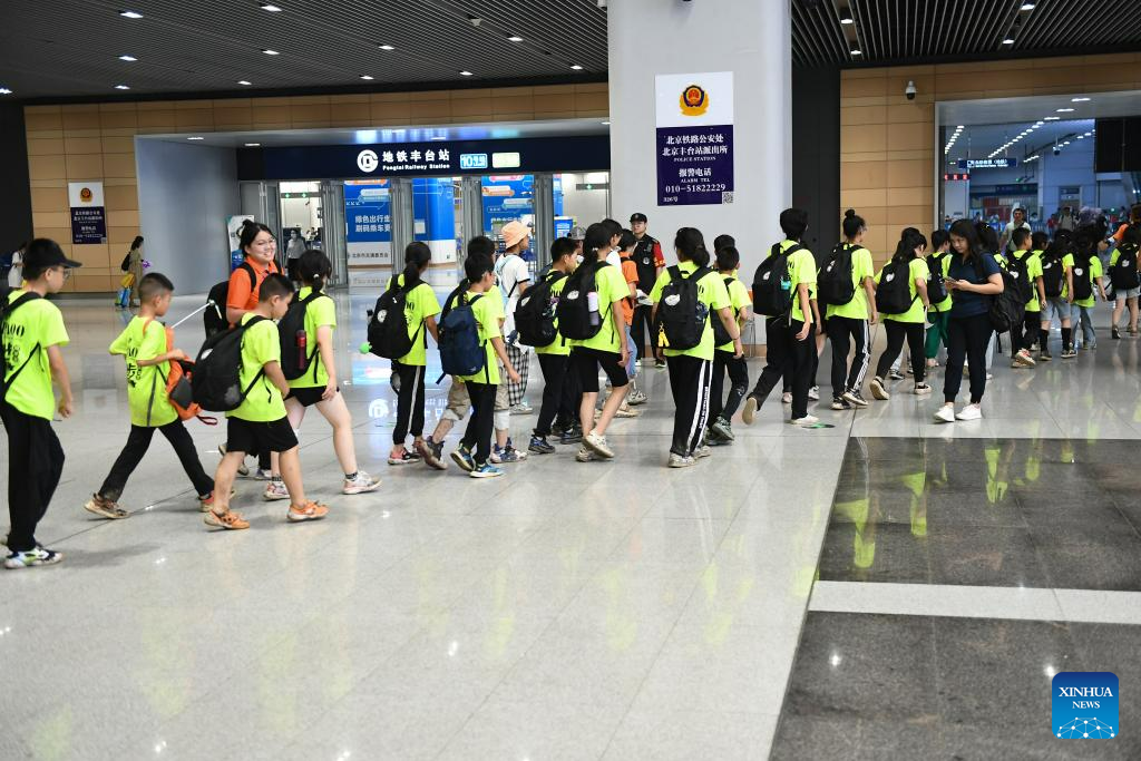 Passengers of Train K396 are led to exit the Beijing Fengtai Railway Station after transfer in Beijing, capital of China, Aug. 2, 2023. Train passengers trapped in Mentougou District due to heavy rainfall have been safely transferred on Wednesday. (Xinhua/Chen Zhonghao)