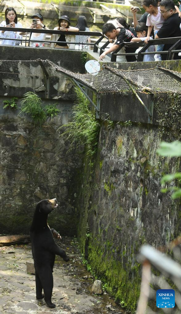 A sun bear interacts with tourists at Hangzhou Zoo in Hangzhou, east China's Zhejiang Province, Aug. 2, 2023. A video of a four-year-old sun bear standing upright like a human being at Hangzhou Zoo in east China's Zhejiang Province went viral on social media recently, attracting an increased number of tourists coming here to see it. (Xinhua/Weng Xinyang)