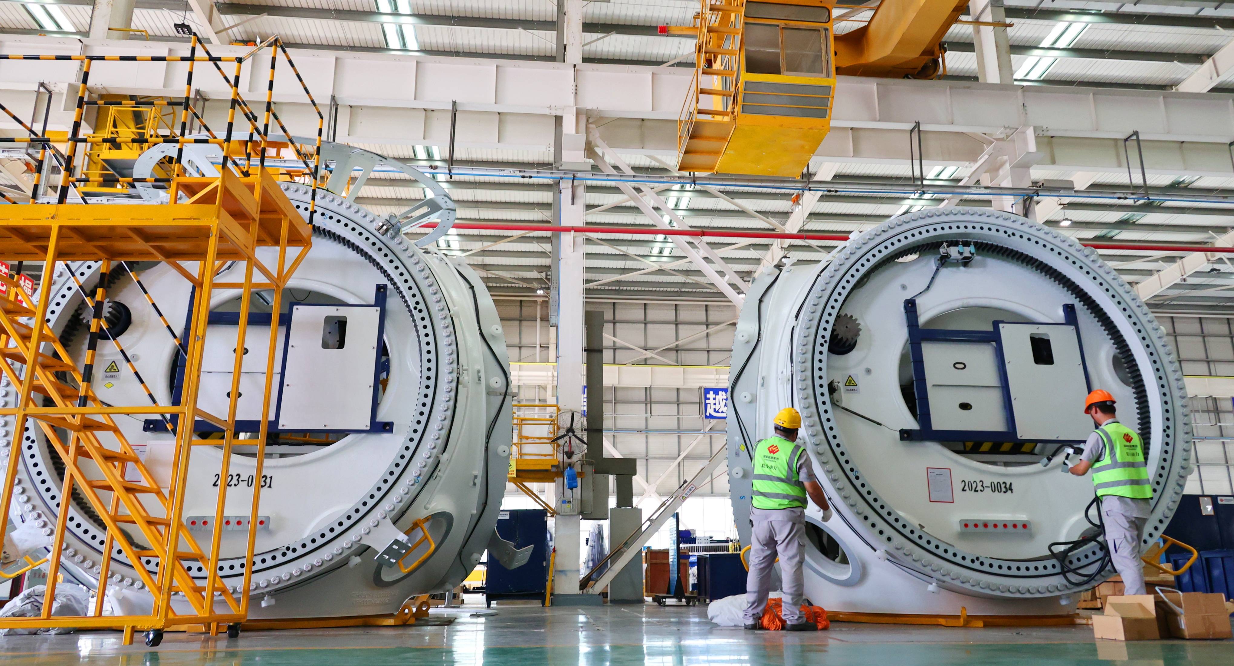 Wind turbine rotors are assembled in a workshop of an enterprise in Lianyungang, east China's Jiangsu province, July 27, 2023. (People's Daily Online/Geng Yuhe)