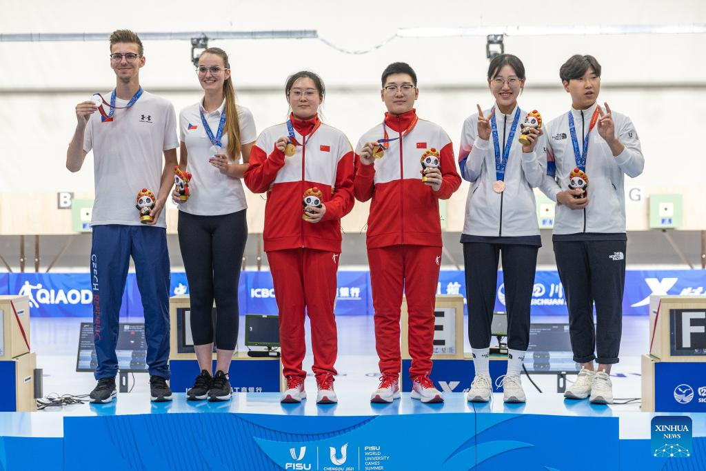 Gold medalists Team China (C), silver medalists Team the Czech Republic (L), bronze medalists Team South Korea pose for photos during the awarding ceremony for the Shooting 10m Air Pistol Mixed Team at the 31st FISU Summer World University Games in Chengdu, southwest China's Sichuan Province, Aug. 2, 2023. (Xinhua/Huang Wei)