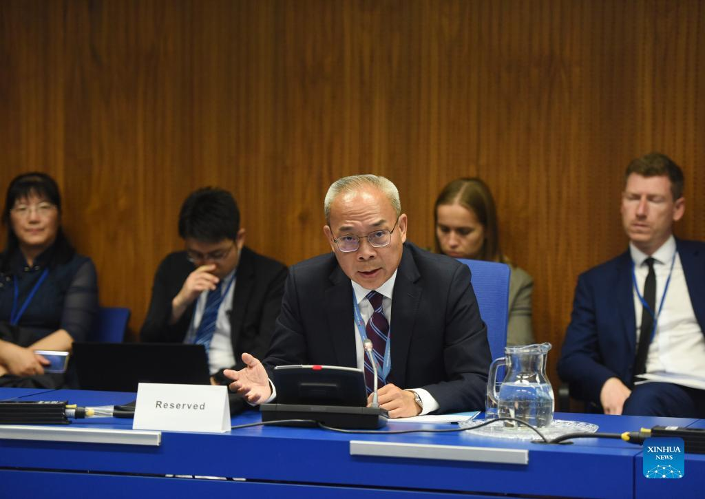 Li Song (Front), China's permanent representative to the United Nations and other international organizations in Vienna, speaks at a seminar in Vienna, Austria, on Aug. 2, 2023. The AUKUS nuclear submarine deal poses a serious risk to regional and global security, according to a joint report released on Wednesday by a Chinese and a Russian think tank at the seminar here. (Xinhua/He Canling)