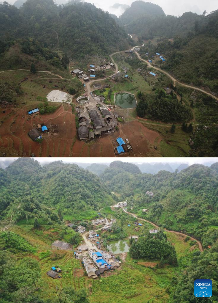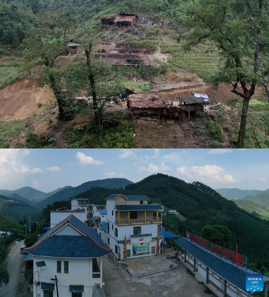 This combination of two aerial photos shows houses built with bricks and mortar in Shuinongtun on March 18, 2018 (above) and new houses constructed with concrete and steel in Shuinongtun on Oct. 16, 2020, in Napo County, south China's Guangxi Zhuang Autonomous Region. (Xinhua/Zhang Ailin)