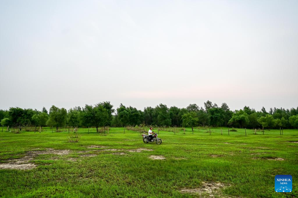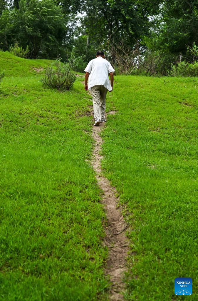 Bai Shun walks on a path to a forest in Bulteger Gacha, Horqin Left Wing Rear Banner of Tongliao City, north China's Inner Mongolia Autonomous Region, Aug. 2, 2023. (Xinhua/Lian Zhen)