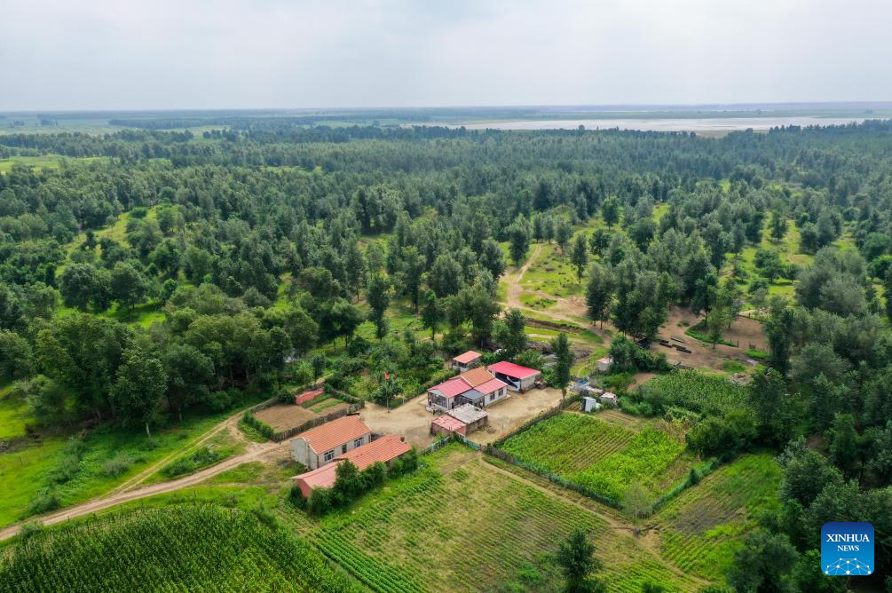 This aerial photo taken on Aug. 2, 2023 shows the house of Bai Shun in Bulteger Gacha, Horqin Left Wing Rear Banner of Tongliao City, north China's Inner Mongolia Autonomous Region. (Xinhua/Lian Zhen)