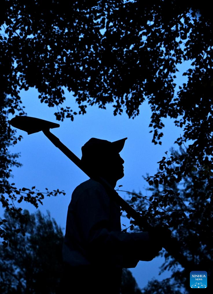 Bai Shun patrols a forest after dinner in Bulteger Gacha, Horqin Left Wing Rear Banner of Tongliao City, north China's Inner Mongolia Autonomous Region, Aug. 2, 2023. (Xinhua/Cai Yang)