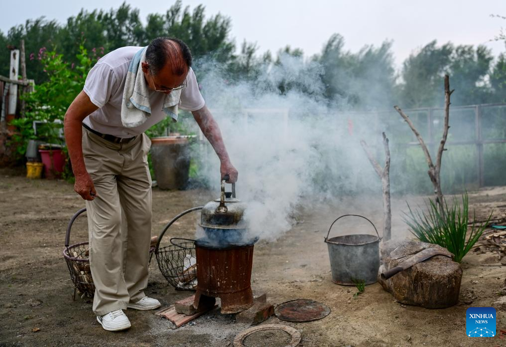 Bai Shun boils water at his house in Bulteger Gacha, Horqin Left Wing Rear Banner of Tongliao City, north China's Inner Mongolia Autonomous Region, Aug. 2, 2023. (Xinhua/Lian Zhen)