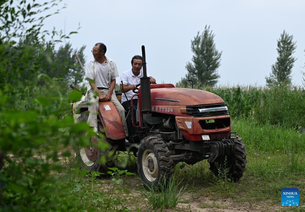 Bai Shun (L) and his son drive a tractor to a forest in Bulteger Gacha, Horqin Left Wing Rear Banner of Tongliao City, north China's Inner Mongolia Autonomous Region, Aug. 2, 2023. (Xinhua/Lian Zhen)
