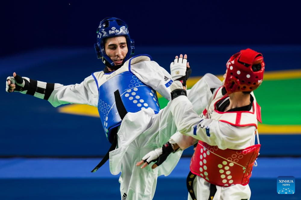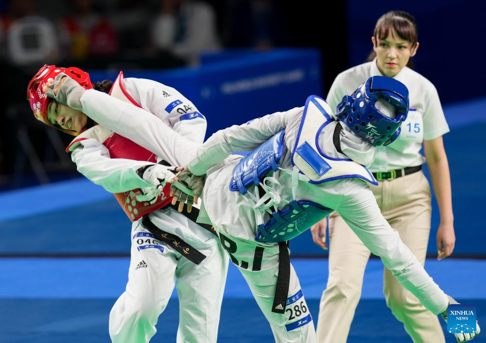 Nahid Kiyanichandeh (L) of Iran competes against Su Po-ya of Chinese Taipei during the taekwondo women's -53kg final at the 31st FISU Summer World University Games in Chengdu, southwest China's Sichuan Province, Aug. 3, 2023. (Xinhua/Liu Lei)