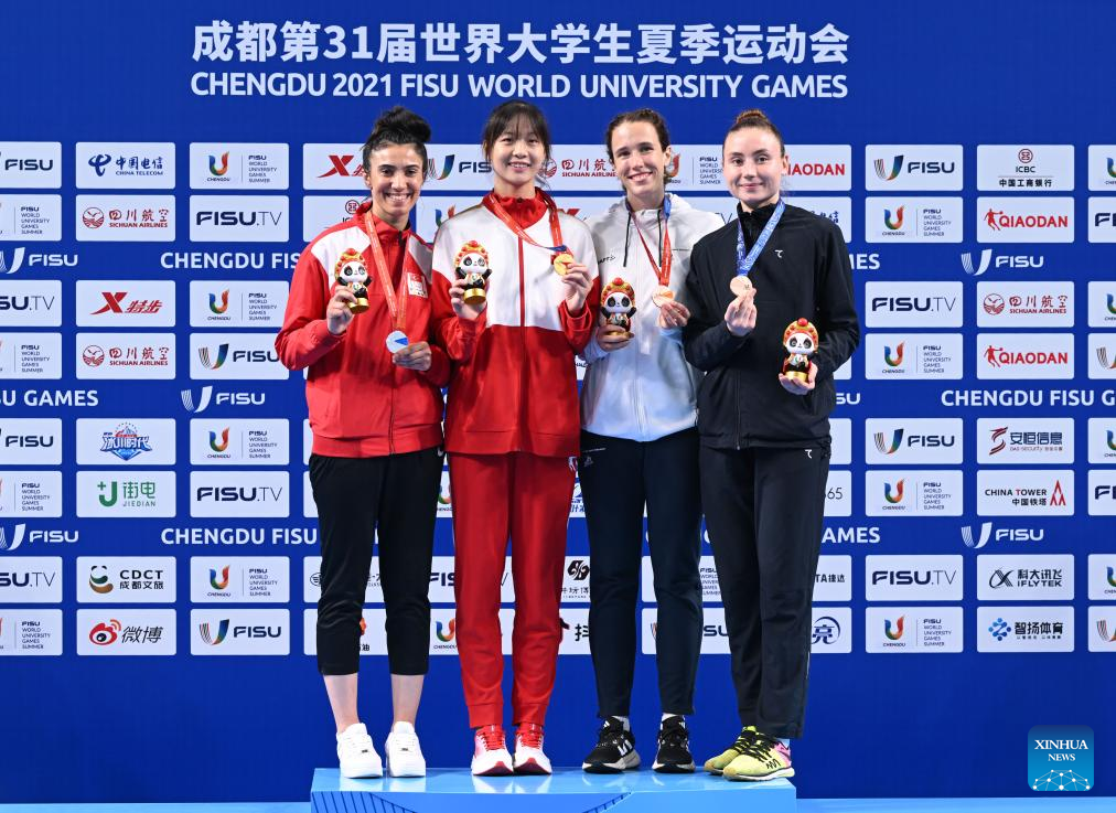 Gold medalist Zhou Zeqi (2nd L) of China, silver medalist Mervenur Erdem (1st L) of Türkiye and bronze medalists Alema Hadzic (2nd R) of Germany and Svetlana Osipova of Uzbekistan pose for photos during the awarding ceremony for the taekwondo women's -73kg at the 31st FISU Summer World University Games in Chengdu, southwest China's Sichuan Province, Aug. 3, 2023. (Xinhua/Liu Lei)