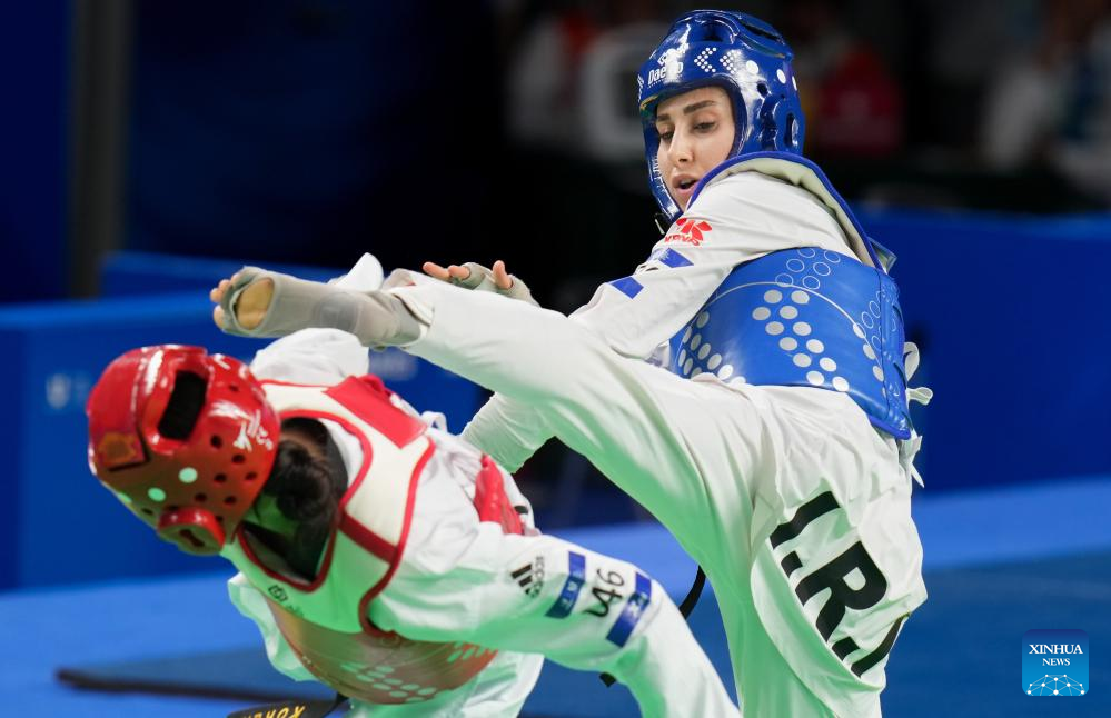Nahid Kiyanichandeh (R) of Iran competes against Su Po-ya of Chinese Taipei during the taekwondo women's -53kg final at the 31st FISU Summer World University Games in Chengdu, southwest China's Sichuan Province, Aug. 3, 2023. (Xinhua/Jiang Hongjing)