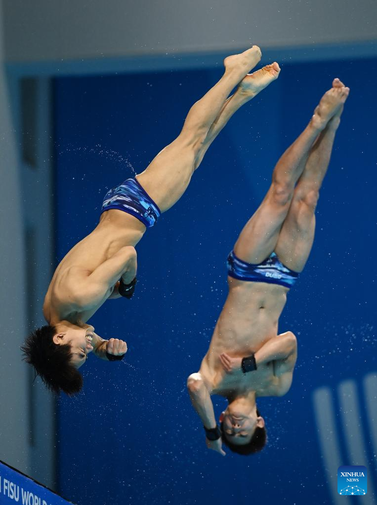 Wang Weiying (Rear) and Yang Ling of China compete during the Mixed Synchronised 3m Springboard Final of diving at the 31st FISU Summer World University Games in Chengdu, southwest China's Sichuan Province, Aug. 3, 2023. (Xinhua/Liu Kun)
