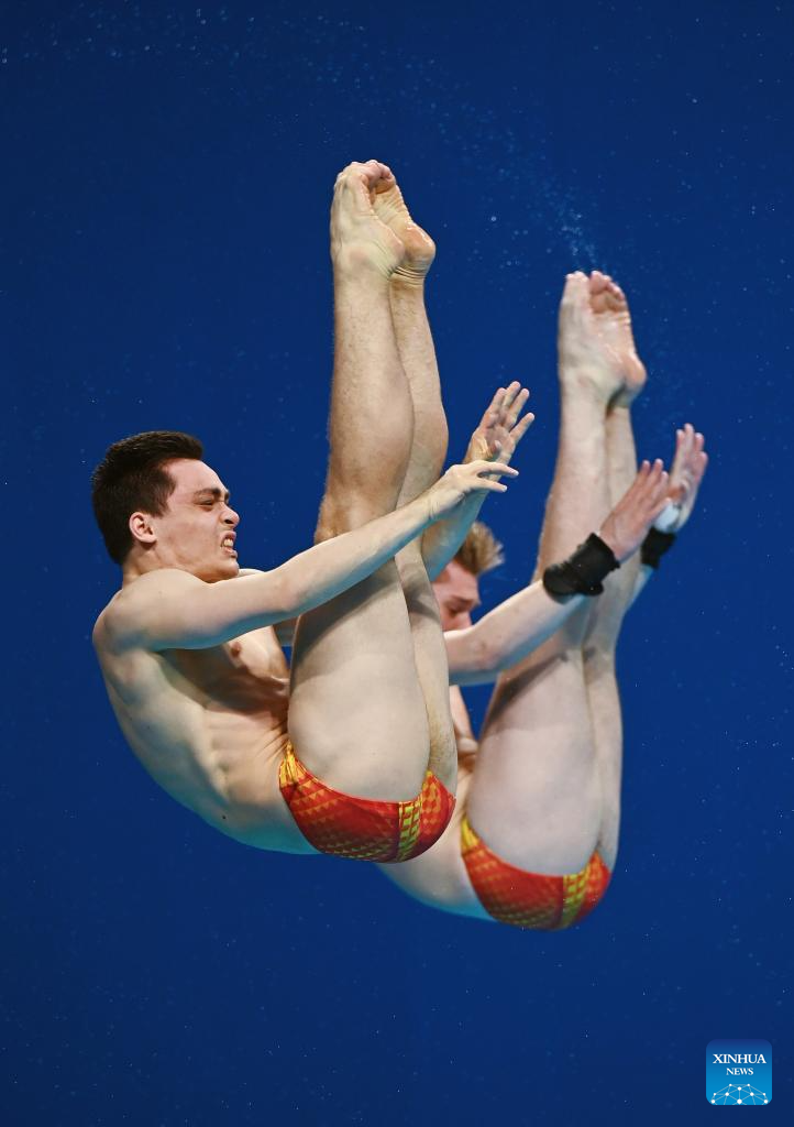 Lou Massenberg (front)/Tom Waldsteiner of Germany compete during the men's synchronised 10m platform final of diving at the 31st FISU Summer World University Games in Chengdu, southwest China's Sichuan Province, Aug. 3, 2023. (Xinhua/Liu Kun)