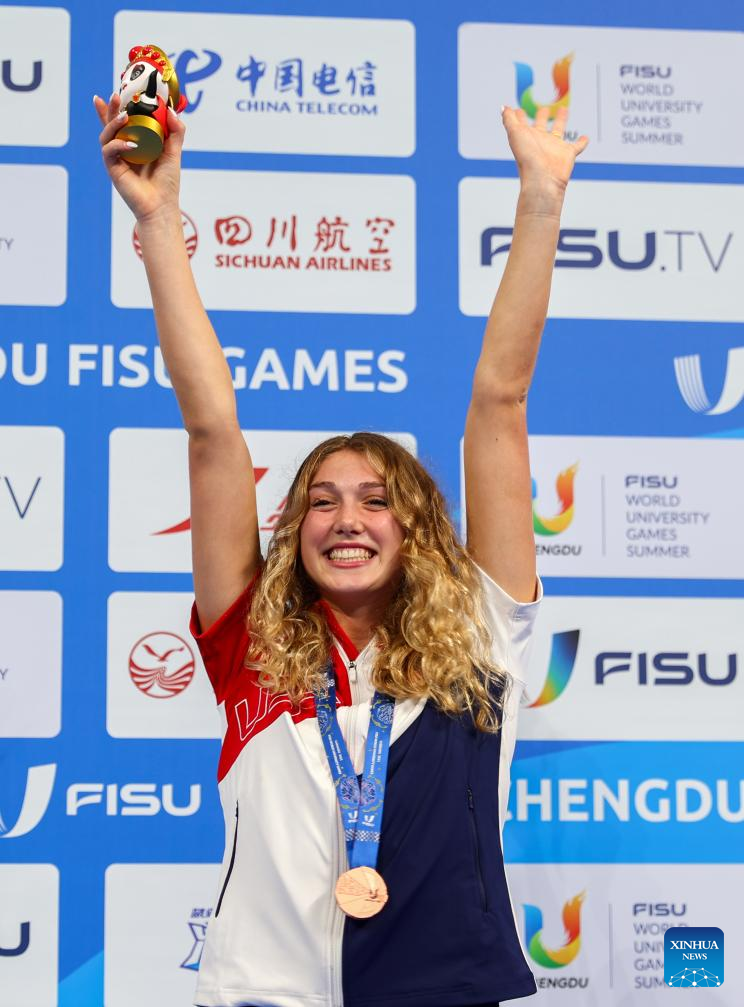 Bronze medalist Sophia Preston McAfee of the United States celebrates during the awarding ceremony for women's 10m platform of diving at the 31st FISU Summer World University Games in Chengdu, southwest China's Sichuan Province, Aug. 3, 2023. (Xinhua/Wang Xiang)