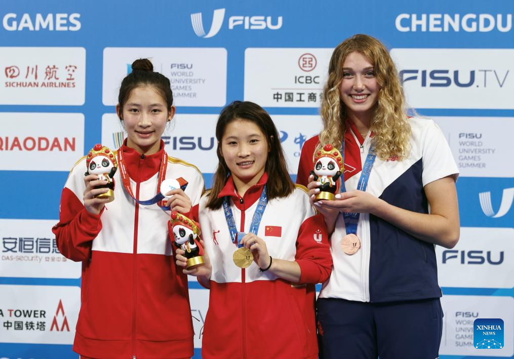 Gold medalist Wang Weiying (C) of China, silver medalist Zhang Rui (L) of China and bronze medalist Sophia Preston McAfee of the United States pose for photos during the awarding ceremony for women's 10m platform of diving at the 31st FISU Summer World University Games in Chengdu, southwest China's Sichuan Province, Aug. 3, 2023. (Xinhua/Wang Xiang)