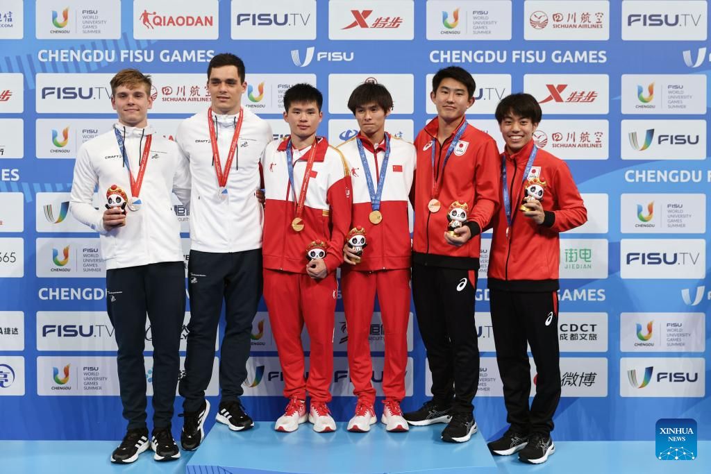Silver medalists Lou Massenberg (2nd L)/Tom Waldsteiner (1st L)of Germany, gold medalists Huang Zigan (3rd L)/Yang Ling (3rd R) of China and bronze medalists Nishida Reo (1st R)/Yamada Shuta of Japan pose for photos during the awarding ceremony for the men's synchronised 10m platform of diving at the 31st FISU Summer World University Games in Chengdu, southwest China's Sichuan Province, Aug. 3, 2023. (Xinhua/Wang Xiang)