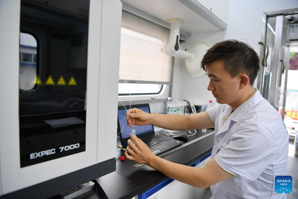 A staff member tests water quality in a water testing vehicle at a temporary water supply point in Zhuozhou, north China's Hebei Province, Aug. 4, 2023. Zhuozhou City is an area in Hebei that has been severely affected by rain-triggered floods. To relieve the water shortages that face the residents, the city has so far set up two temporary water supply points which are capable of making and outputting water. (Xinhua/Mu Yu)