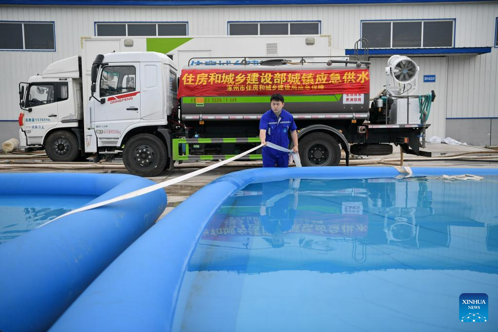 A staff member works at a temporary water supply point in Zhuozhou, north China's Hebei Province, Aug. 4, 2023. Zhuozhou City is an area in Hebei that has been severely affected by rain-triggered floods. To relieve the water shortages that face the residents, the city has so far set up two temporary water supply points which are capable of making and outputting water. (Xinhua/Mu Yu)