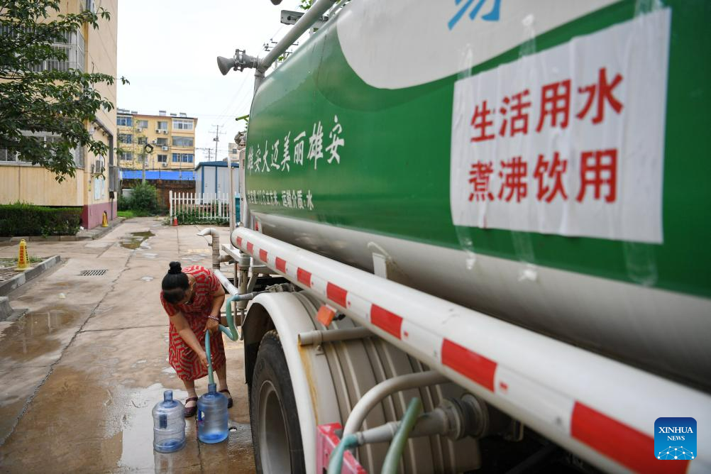 A resident draws water from a water supply vehicle in Zhuozhou, north China's Hebei Province, Aug. 4, 2023. Zhuozhou City is an area in Hebei that has been severely affected by rain-triggered floods. To relieve the water shortages that face the residents, the city has so far set up two temporary water supply points which are capable of making and outputting water. (Xinhua/Mu Yu)