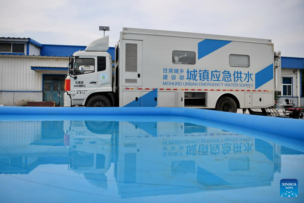 A water testing vehicle is seen at a temporary water supply point in Zhuozhou, north China's Hebei Province, Aug. 4, 2023. Zhuozhou City is an area in Hebei that has been severely affected by rain-triggered floods. To relieve the water shortages that face the residents, the city has so far set up two temporary water supply points which are capable of making and outputting water. (Xinhua/Mu Yu)