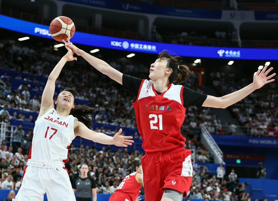 Han Xu (R) of China blocks Minami Ikematsu of Japan during their basketball women's final at the 31st FISU Summer World University Games in Chengdu, southwest China's Sichuan Province, Aug. 5, 2023. (Xinhua/Lan Hongguang)