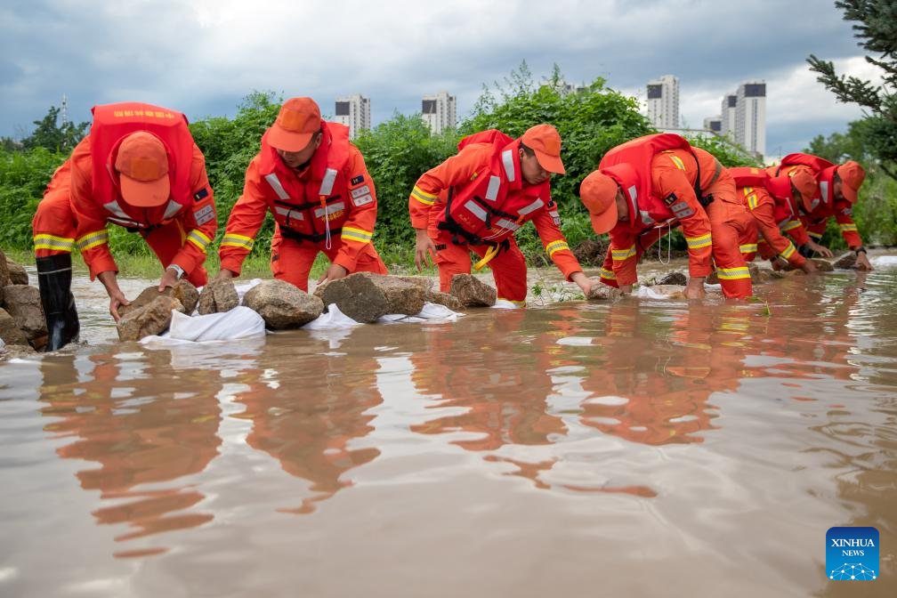 Firefighters transfer rocks to block floods near Dawan Village of Dong'an District, Mudanjiang, northeast China's Heilongjiang Province, Aug. 5, 2023. Triggered by torrential rains in the city of Mudanjiang and the provincial capital Harbin, water levels of some rivers here have surpassed the warning water level. Emergency rescue teams including local firefighters and forest firefighters have been dispatched to help with the rescue and relief work. The 24-hour patrols on the embankments have been conducted to control risks, and the floods affected residents have been relocated. (Xinhua/Zhang Tao)