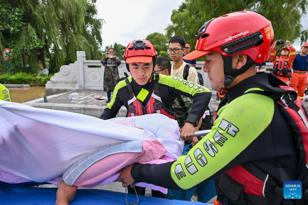 Firefighters transfer a patient in Yanshou County of Harbin, northeast China's Heilongjiang Province, Aug. 5, 2023. Triggered by torrential rains in the city of Mudanjiang and the provincial capital Harbin, water levels of some rivers here have surpassed the warning water level. Emergency rescue teams including local firefighters and forest firefighters have been dispatched to help with the rescue and relief work. The 24-hour patrols on the embankments have been conducted to control risks, and the floods affected residents have been relocated. (Xinhua/Chen Yichen)