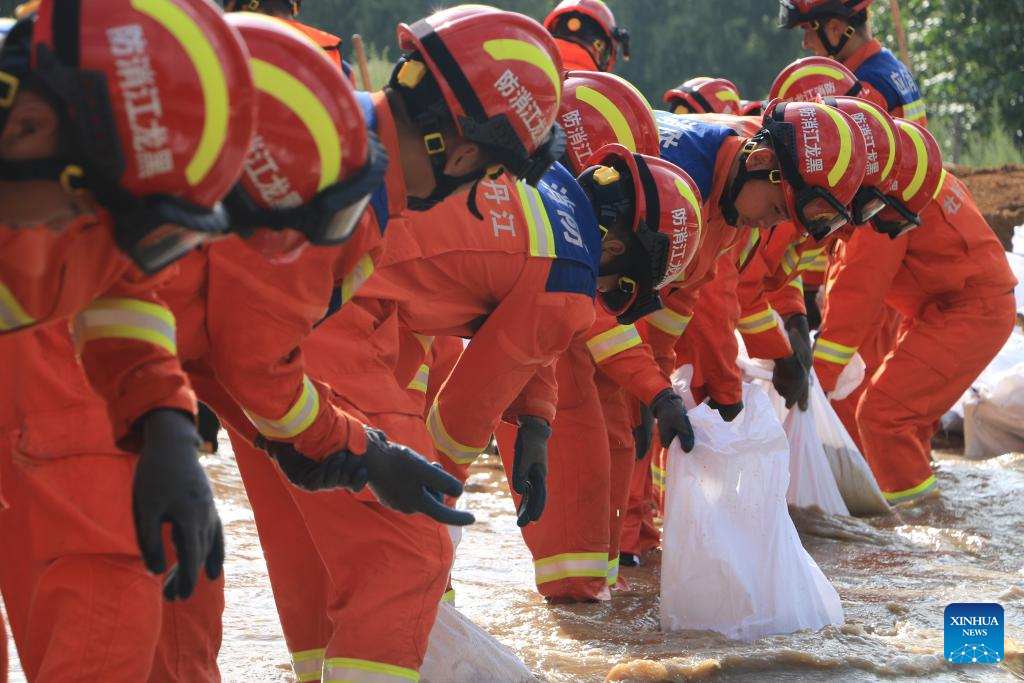 Firefighters transfer sandbags in Yangming District of Mudanjiang, northeast China's Heilongjiang Province, Aug. 5, 2023. Triggered by torrential rains in the city of Mudanjiang and the provincial capital Harbin, water levels of some rivers here have surpassed the warning water level. Emergency rescue teams including local firefighters and forest firefighters have been dispatched to help with the rescue and relief work. The 24-hour patrols on the embankments have been conducted to control risks, and the floods affected residents have been relocated. (Xinhua)