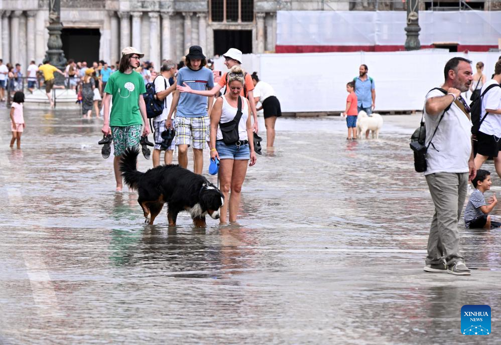 This photo taken on Aug. 4, 2023 shows a waterlogged area in Venice, Italy. The water level in Venice has risen recently, and some areas in the city are waterlogged. (Photo by Alberto Lingria/Xinhua)