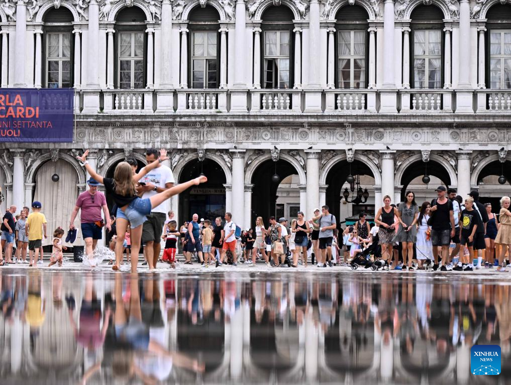 Children play in a waterlogged area in Venice, Italy, Aug. 4, 2023. The water level in Venice has risen recently, and some areas in the city are waterlogged. (Photo by Alberto Lingria/Xinhua)