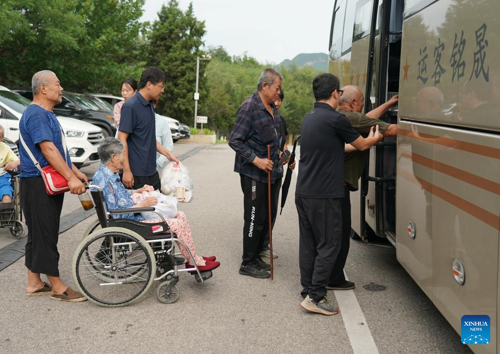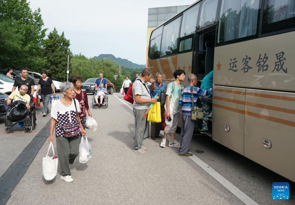 Villagers take a bus to leave a settlement site and return to their homes in Koutou Village of Qinglonghu Town in Fangshan District of Beijing, capital of China, Aug. 5, 2023. As this round of typhoon-induced torrential rains have come to an end in Beijing, some villagers of Fangshan District, who had been evacuated to settlement sites due to heavy rainfall over the previous few days, returned home on Saturday after experts assessed the safety of their residences.