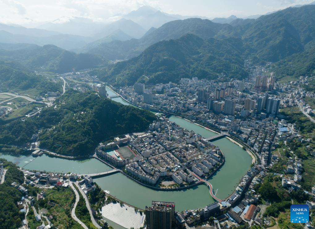 This aerial photo taken on Aug. 4, 2023 shows a view of Langao County, northwest China's Shaanxi Province. Located in the Qinba mountains of Shaanxi, the county of Langao has utilized its natural and cultural resources in recent years to promote high-quality development through tourism industry. In the first half of 2023, the county received more than four million tourists, up 63.65 percent year on year. (Xinhua/Shao Rui)