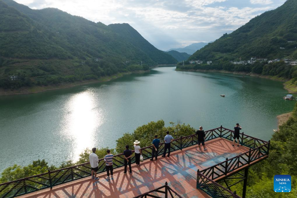 This aerial photo taken on Aug. 4, 2023 shows the scenery of Shenheyuan scenic spot in Langao County, northwest China's Shaanxi Province. Located in the Qinba mountains of Shaanxi, the county of Langao has utilized its natural and cultural resources in recent years to promote high-quality development through tourism industry. In the first half of 2023, the county received more than four million tourists, up 63.65 percent year on year. (Xinhua/Shao Rui)