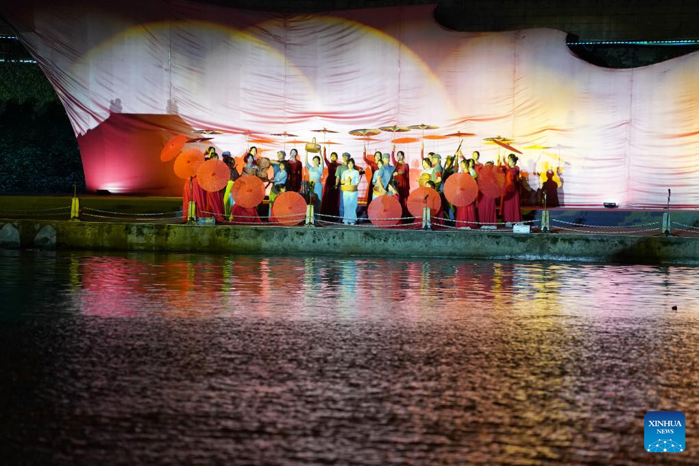 Artists perform by the Lanhe River in Langao County, northwest China's Shaanxi Province, Aug. 3, 2023. Located in the Qinba mountains of Shaanxi, the county of Langao has utilized its natural and cultural resources in recent years to promote high-quality development through tourism industry. In the first half of 2023, the county received more than four million tourists, up 63.65 percent year on year. (Xinhua/Shao Rui)