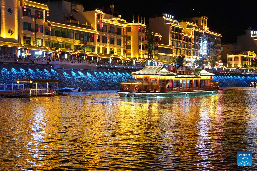 This photo taken on Aug. 3, 2023 shows a night view of Lanhe River in Langao County, northwest China's Shaanxi Province. Located in the Qinba mountains of Shaanxi, the county of Langao has utilized its natural and cultural resources in recent years to promote high-quality development through tourism industry. In the first half of 2023, the county received more than four million tourists, up 63.65 percent year on year. (Xinhua/Shao Rui)