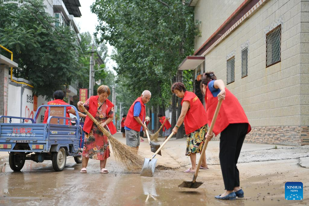 Volunteers clear sludge in the street in Diaowo Township, Zhuozhou, north China's Hebei Province, Aug. 6, 2023. With flood water subsiding, local residents, volunteers and rescuers in Zhuozhou are carrying out cleaning-up, disinfection, and drainage operations to bring losses down to the minimum level. (Xinhua/Mu Yu)
