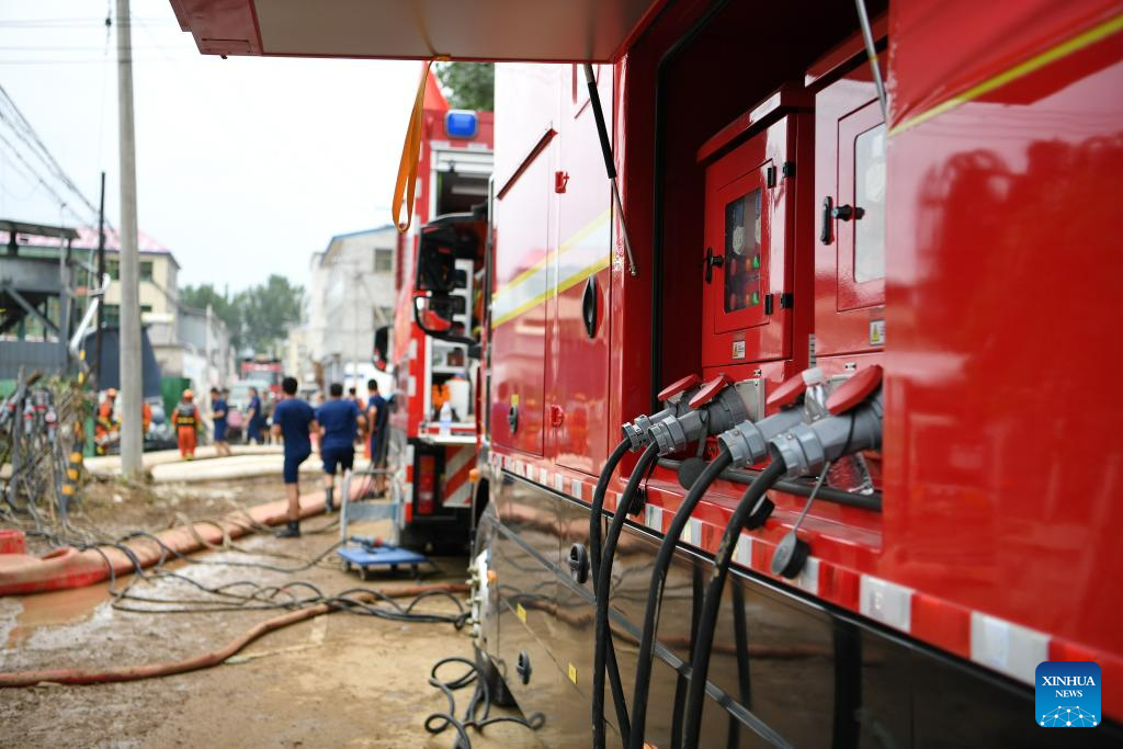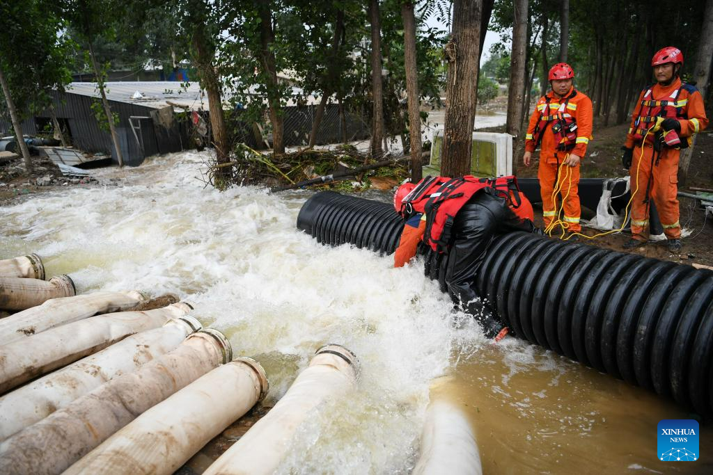 Drainage facilities in operation are pictured in Diaowo Township, Zhuozhou, north China's Hebei Province, Aug. 6, 2023. With flood water subsiding, local residents, volunteers and rescuers in Zhuozhou are carrying out cleaning-up, disinfection, and drainage operations to bring losses down to the minimum level. (Xinhua/Mu Yu)