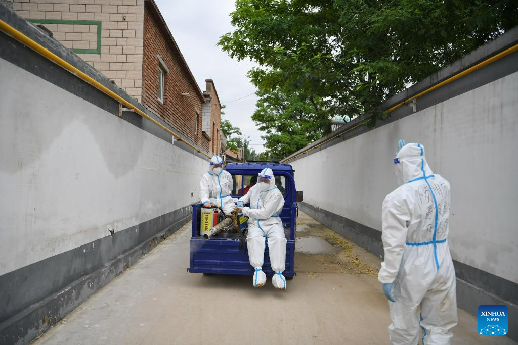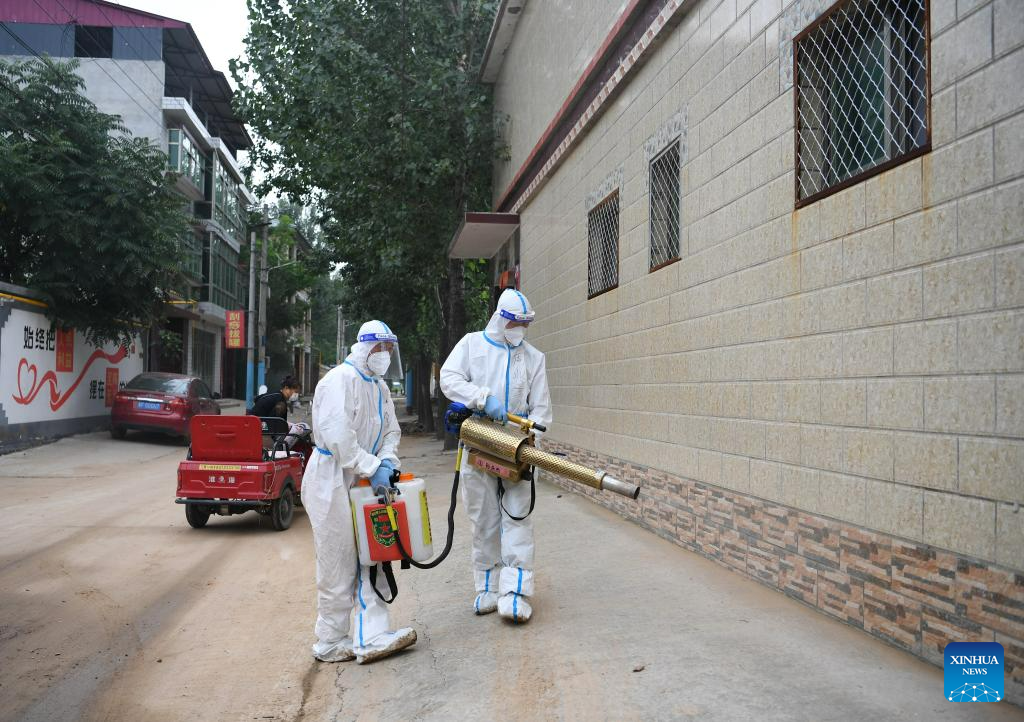Volunteers perform outdoor disinfection in Diaowo Township, Zhuozhou, north China's Hebei Province, Aug. 6, 2023. With flood water subsiding, local residents, volunteers and rescuers in Zhuozhou are carrying out cleaning-up, disinfection, and drainage operations to bring losses down to the minimum level. (Xinhua/Mu Yu)