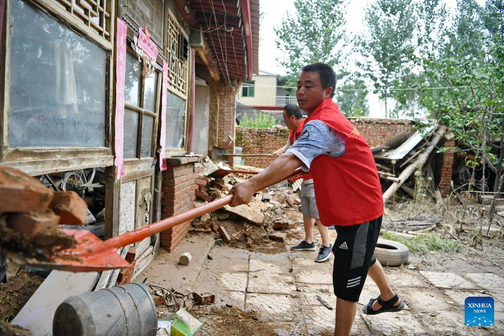 Volunteers clear debris at a flood-affected yard in Diaowo Township, Zhuozhou, north China's Hebei Province, Aug. 6, 2023. With flood water subsiding, local residents, volunteers and rescuers in Zhuozhou are carrying out cleaning-up, disinfection, and drainage operations to bring losses down to the minimum level. (Xinhua/Mu Yu)