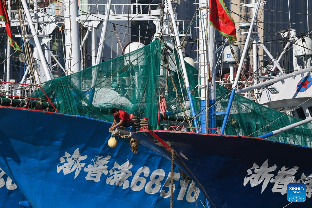 A fisherman makes preparation for fishing at Shenjiamen port in Zhoushan City, east China's Zhejiang Province, Aug. 6, 2023. Four types of fishing boats with special permission set sail on Sunday after a summer fishing ban, which was originally scheduled to end on Aug. 1 but has been postponed for a few days due to typhoon concerns. (Xinhua/Xu Yu)