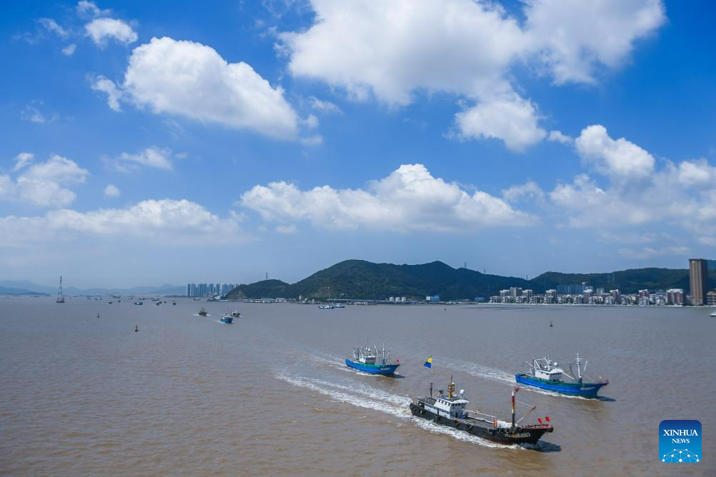 This aerial photo shows fishing boats setting sail for fishing from Shenjiamen port in Zhoushan City, east China's Zhejiang Province, Aug. 6, 2023. Four types of fishing boats with special permission set sail on Sunday after a summer fishing ban, which was originally scheduled to end on Aug. 1 but has been postponed for a few days due to typhoon concerns. (Xinhua/Xu Yu)