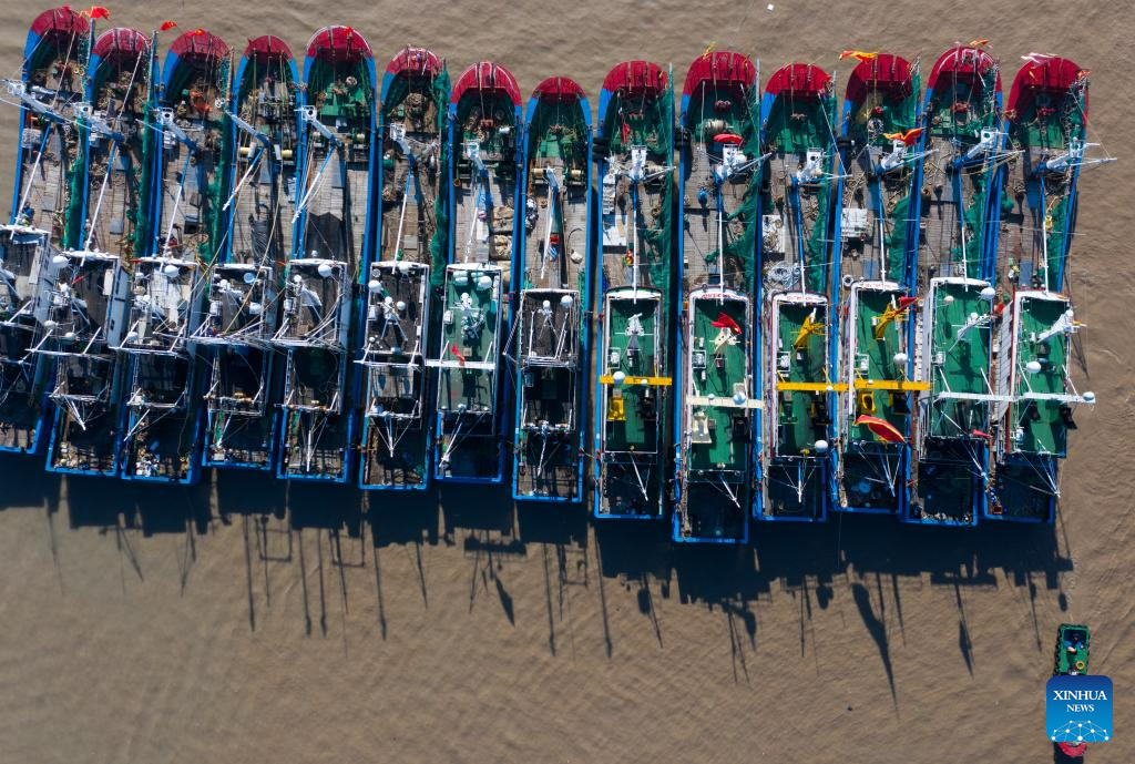 This aerial photo taken on Aug. 6, 2023 shows fishing boats at Shenjiamen port in Zhoushan City, east China's Zhejiang Province. Four types of fishing boats with special permission set sail on Sunday after a summer fishing ban, which was originally scheduled to end on Aug. 1 but has been postponed for a few days due to typhoon concerns. (Xinhua/Xu Yu)