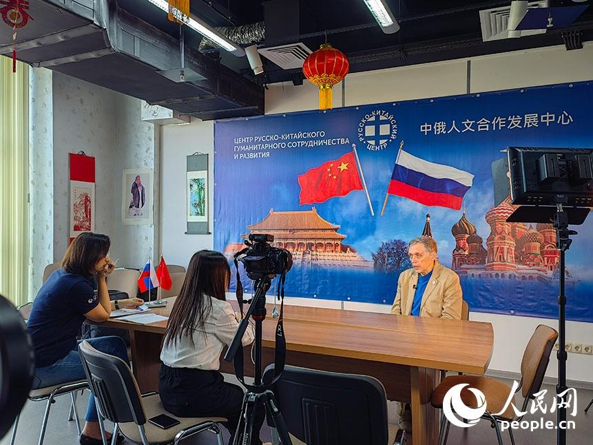 People's Daily Online journalists conduct an interview at a?China-Russia cultural cooperation and development center in Moscow, Russia. (People's Daily Online/Shen Yaxin)