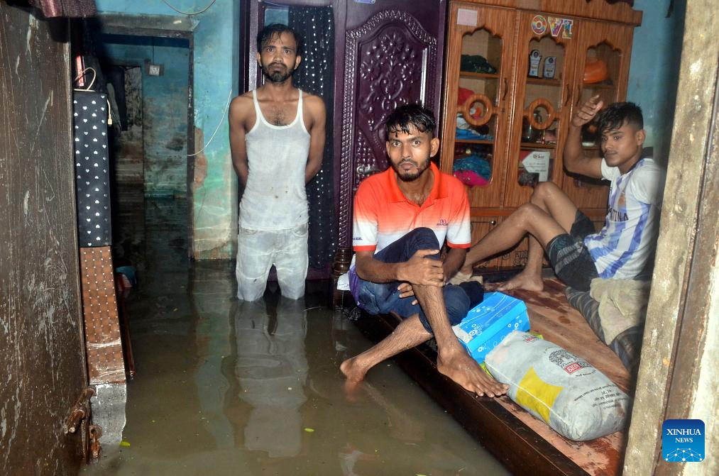 This photo taken on Aug. 6, 2023 shows dwellers of a waterlogged house in Chattogram, Bangladesh. Days of torrential rain lashed the Bangladesh's seaport city Chattogram, some 242 km southeast of capital Dhaka, inundating low-lying areas and disrupting road traffic. (Xinhua)