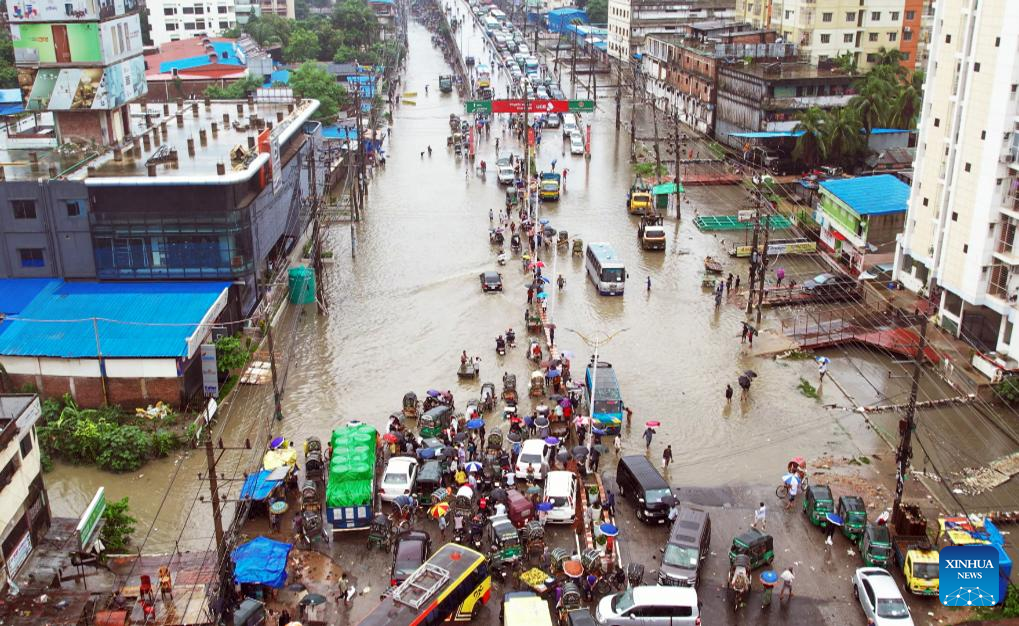 Vehicles drive on a water-logged road in Chattogram, Bangladesh, Aug. 6, 2023. Days of torrential rain lashed the Bangladesh's seaport city Chattogram, some 242 km southeast of capital Dhaka, inundating low-lying areas and disrupting road traffic. (Xinhua)
