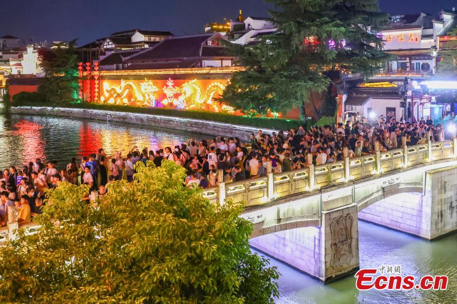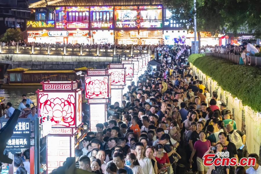 Tourists visit Fuzimiao historic district of Nanjing, east China's Jiangsu Province, Aug. 6, 2023. Illuminated Qinhuai River reflects the prosperity of a capital of six Chinese dynasties in ancient China. (Photo: China News Service/Yang Bo)
