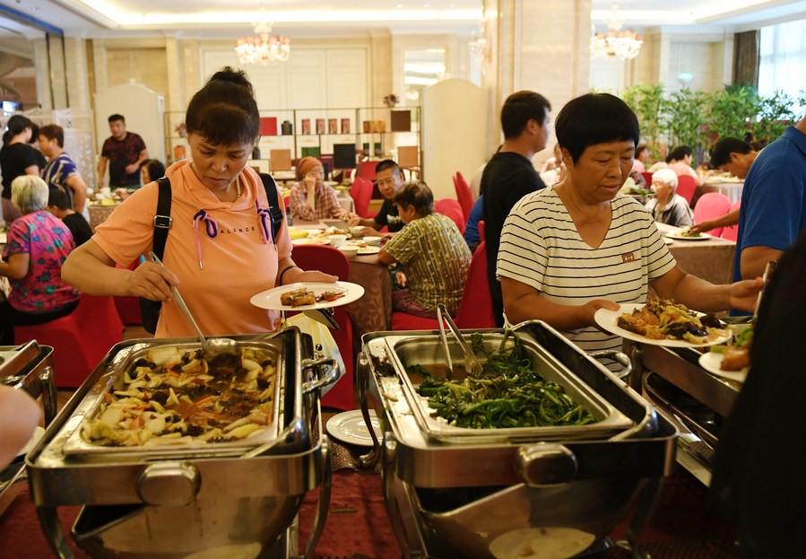 Villagers of Qinglonghu Town have meal at a temporary shelter after being evacuated from flood-hit areas in Fangshan District, Beijing, Aug. 1, 2023. (Xinhua/Zhang Chenlin)
