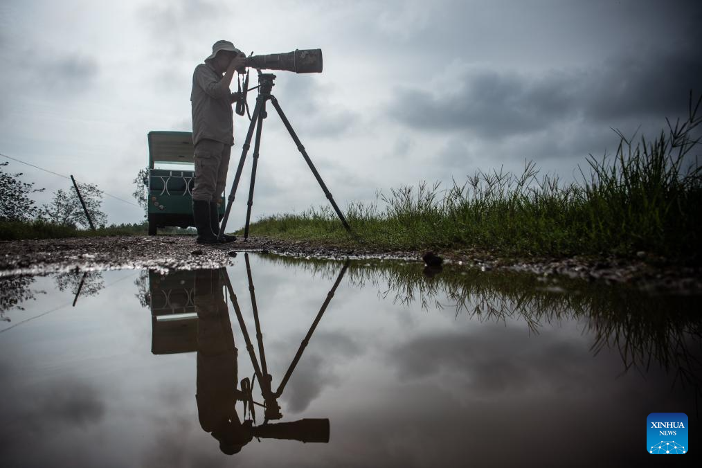 Engineer Zhang Yuming takes photos of milu deer at Shishou Milu Deer National Nature Reserve in central China's Hubei Province, Aug. 2, 2023. (Xinhua/Wu Zhizun)