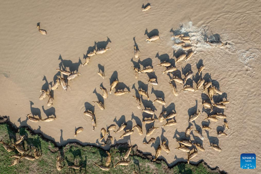 This aerial photo taken on Aug. 1, 2023 shows milu deer at Shishou Milu Deer National Nature Reserve in central China's Hubei Province. (Xinhua/Wu Zhizun)