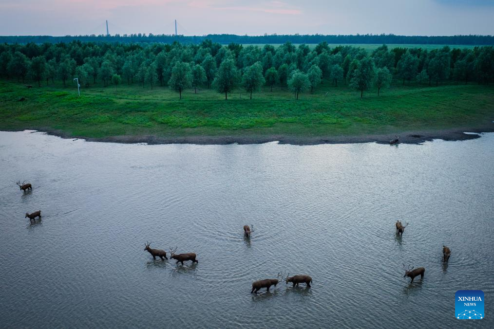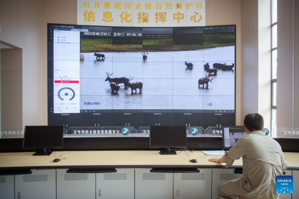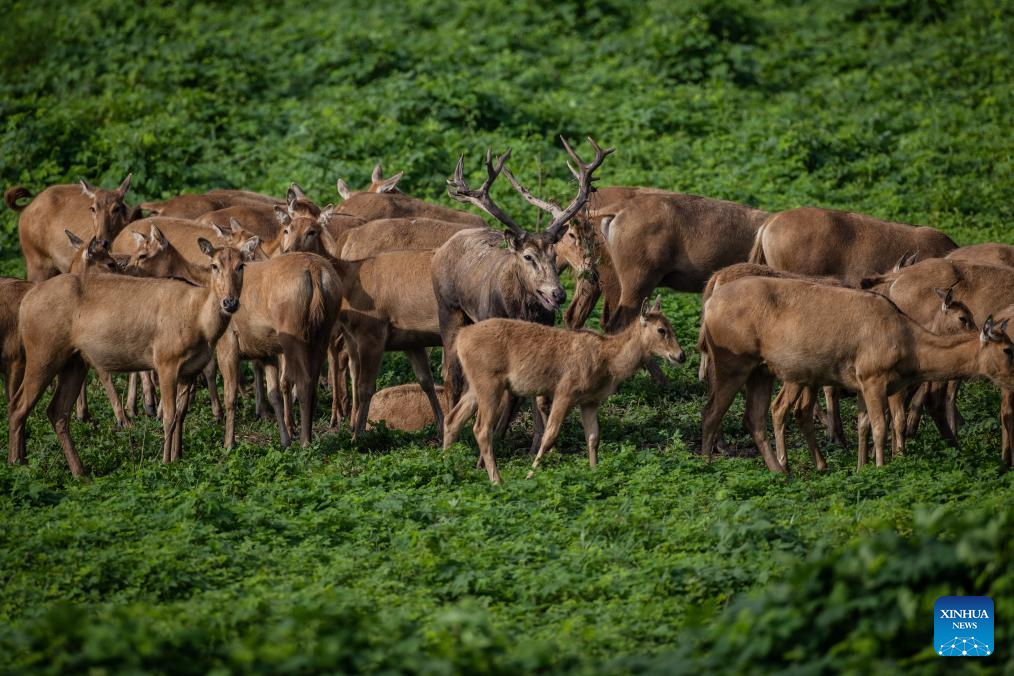 After years of efforts by protectors and continuous improvement of the local ecological environment, the population of milu deer at the nature reserve has increased rapidly, nearing 2,000 to date. There are more than 10 naturally formed breeding groups in varying sizes among these milu deer, and more baby milu deer are expected to come to the world after mating season this year.